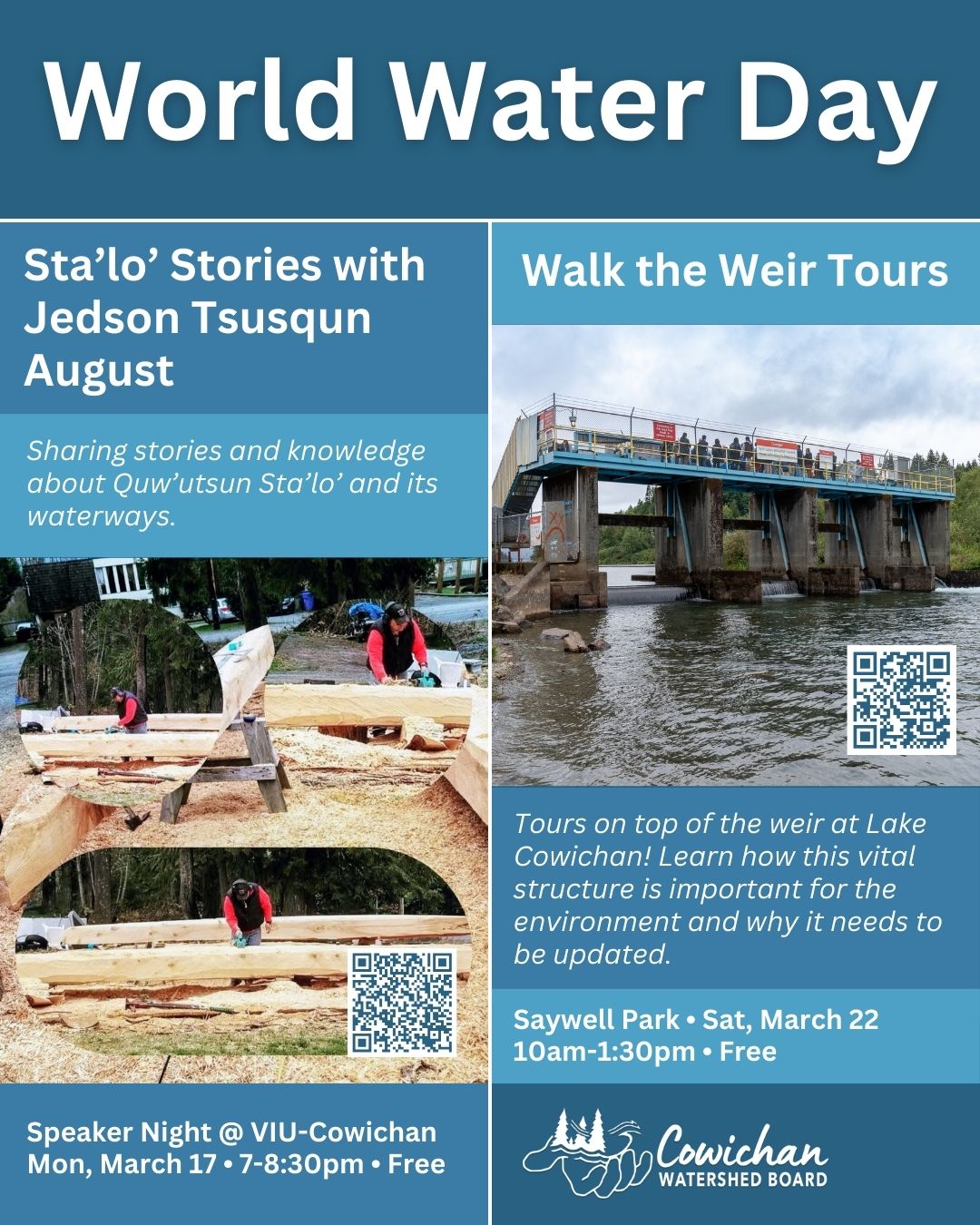 This event will focus on the health of the Quw'utsun Sta'lo which is sometimes called the heart of Quw'utsun territory, and will begin with words from elder Philomena Williams. The Cowichan Watershed Board's Co-Chairs, Chief Hwitsum (Cowichan Tribes) and Chair Stone (CVRD), will share their work and perspectives on the decades long effort to replace the weir. Our Strategic Priorities Director Tom Rutherford will provide an overview of the situation now, and then technical leaders and partners will be available for an interactive Q&A about how "weir" doing, and how you can help. The Cowichan Lake and River Stewards will also be on hand with letter writing supplies for those who feel inspired. https://www.cowichan-lake-stewards.ca/ Read about the project to replace the weir here.