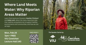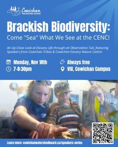 The Speakers Series features engaging speakers sharing their knowledge and expertise on topics relevant to the well-being and sustainability of the Cowichan watershed, within Quw’utsun territory. The series is hosted by the Cowichan Watershed Board, with the support of VIU Cowichan and the Real Estate Foundation of BC, and our generous speakers. It occurs on the 3rd Monday of the month, in select months.