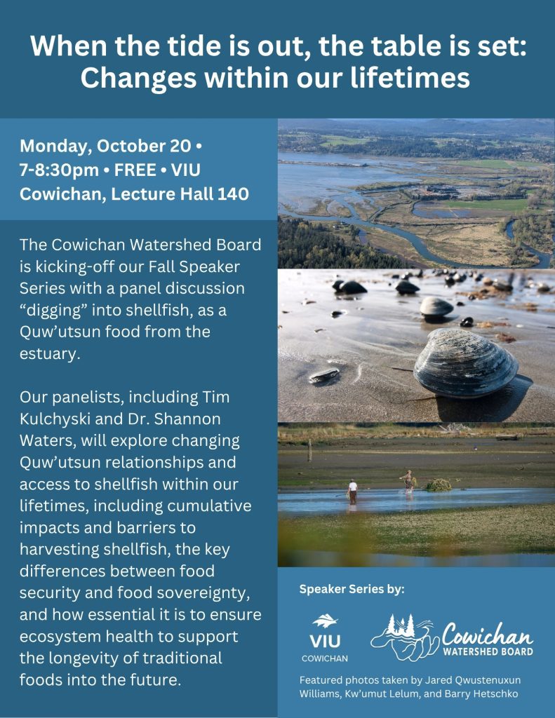 The Cowichan Watershed Board is honoured to kick-off our Fall Speaker Series with a panel discussion “digging" into the topic of shellfish, as a Quw’utsun food from the estuary. Our panelists include, Dr. Shannon Waters and Tim Kulchyski. Shannon is a member of the Stz’uminus First Nation with many family ties to Qwu’utsun. She currently serves as the first ever Deputy Provincial Health Officer for Planetary and Water Health. Tim is a Cowichan Tribes community member and Natural Resource Consultant for Cowichan Tribes in the Lands and Self-Governance Department.